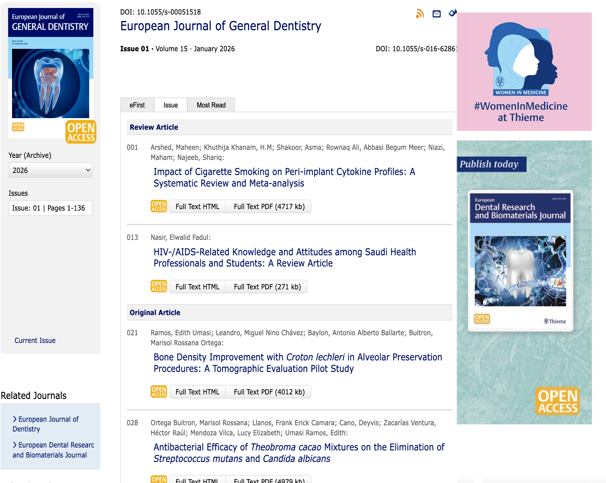 The European Journal of General Dentistry is thrilled to share that Volume 15, Issue 1 is now accessible online. We are delighted to offer open access to all our articles. Esteemed for its recognition, the European Journal of General Dentistry is listed in prestigious databases like SCOPUS, EBSCO, and ProQuest.